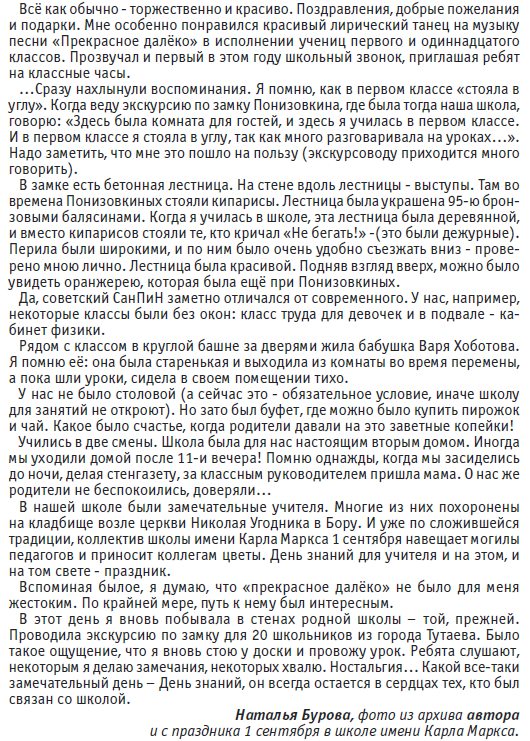 Нынче первого сентября в Бору я навестила учительницу Лидию Сергеевну Трескину, ветерана педагогического труда. Она вспомнила свое первое сентября в роли педагога. Было это в 1949-ом году в селе Бор, она, молодая учительница, вела тогда свой пятый класс в количестве 40 человек (!) на линейку. Одета была в легкое, простое и недорогое, но симпатичное платье розового цвета…
